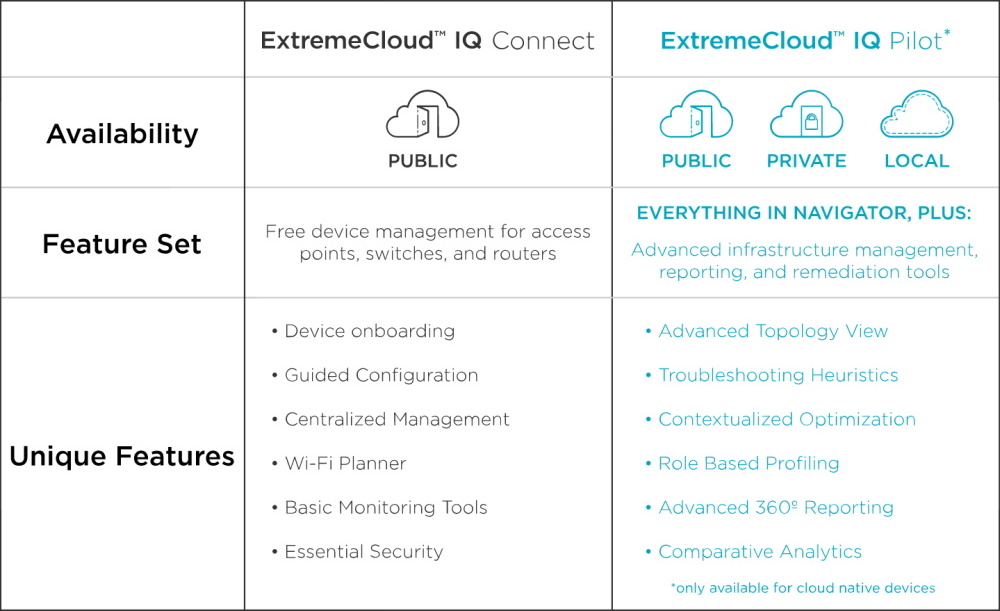 Standaard ontvangt u bij uw Extreme Networks access point toegang tot alle functies die behoren tot het licentievrije ExtremeCloud IQ Connect. Wilt u gebruikmaken van geavanceerdere functionaliteiten voor netwerkbeheer en rapportage? Dan heeft u deze ExtremeCloud IQ Pilot licentie nodig. Hiermee kunt u bijvoorbeeld naast de public cloud ook kiezen voor een private of local cloud. Bovendien biedt het een uitgebreide topologie, configuratie en beheer van netwerkapparatuur op schaal, geavanceerde troubleshooting en meer. Bekijk de verschillen ook in onderstaande video.Voormalig Aerohive Networks
