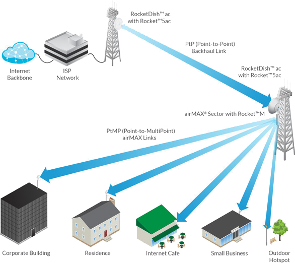 Op de afbeelding hieronder ziet u hoe de RocketDish antenne kan worden toegepast in combinatie met een Rocket 5AC access point. Het signaal wordt vanaf deze apparaten doorgestuurd naar een derde antenne met access point, die de beschikbare bandbreedte verdeelt over verschillende locaties.